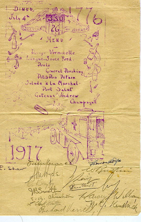 I am enclosing the menu for the 4th of July dinner which was all that we had in the way of a celebration. I could also send the cork of the first bottle of champagne that I had the honor to open. We had quite a feast, what with our own efforts and a contribution of some twenty-five bottles of champagne from the general of the division.
